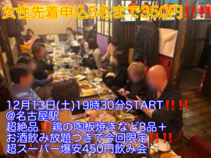 そんな、名古屋地区の12月のイベントは、会費が通常よりもさらに「安い‼️」超スーパー爆安飲み会を開催いたします‼️‼️