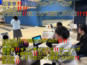 そんな、関西地区の3月度のイベントは、年に数回しか開催されない、「超豪華‼️3,000円分のギフト券が当たる‼️」ボーリング大会つきの飲み会を開催いたします‼️‼️