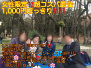 (お花見史上超爆安1,000円ぽっきり!!)【3月29日(日)11時〜浜松町】超絶景!!東京タワーコントラスト抜群スポットで仕出し弁当等食事+お酒など超爆安お花見縁活会