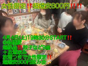 (女性限定!!超爆安800円!!!!)【4月4日(土)19時30分〜新橋駅】超絶品!!中身ぎっしり餃子など9品+お酒飲み放題つきで女性限定!!超爆安800円飲み会